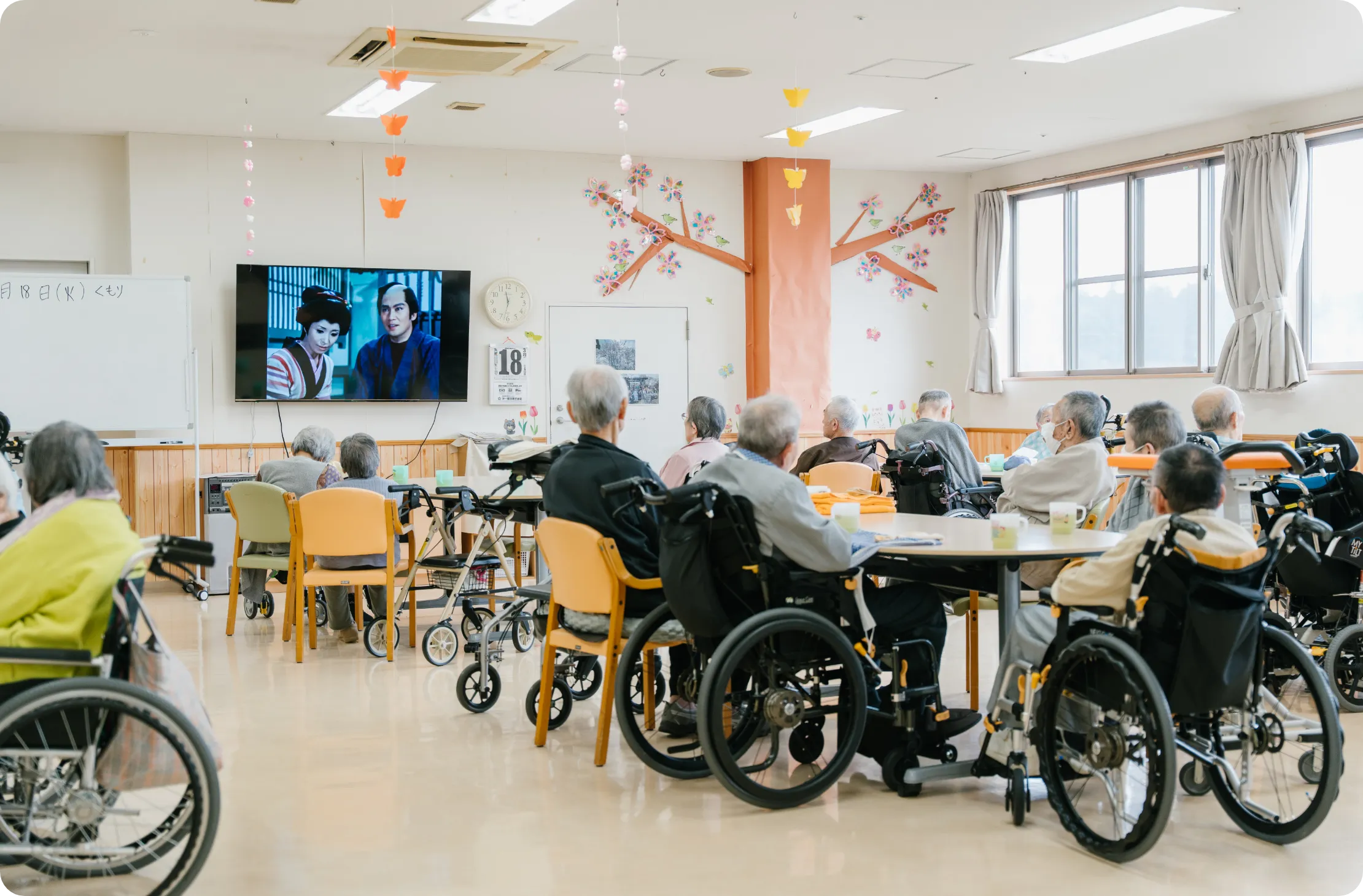 開放的なホールは、利用者さま同士がふれあい、笑顔を交わす場となっています。
